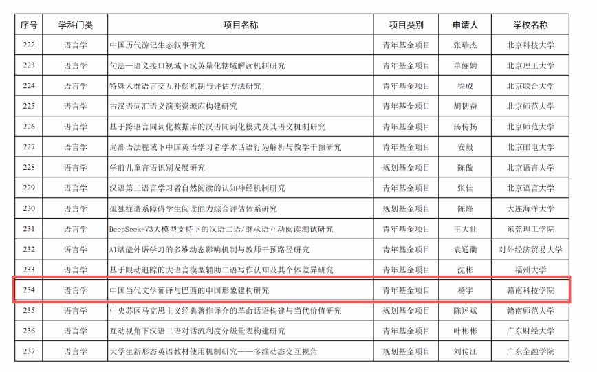本网讯 :9月25日,教育部社会科学司正式公布2025年度教育部人文社会科学研究一般项目评审结果。我校文法学院葡萄牙语专业教师杨宇申报的《中国当代文学葡译与巴西的中国形象建构研究》成功获批青年基金项目。